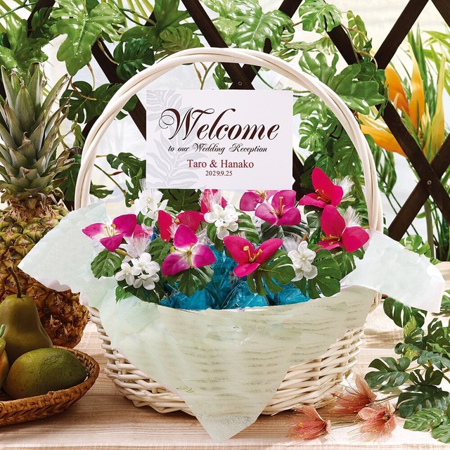 ミニタオル40個入り(ピンクハイビスカス20個/ブルーホヌ20個) バスケット:ウィロー 径約29×10cm(ハンドル上まで35cm) クロス:不織布(ペパーミントグリーン色) ミニタオル(袋入り):径約4×14cm ......................................................................................................................... ・ご注文の際は【ローマ字表記のご新郎新婦名と挙式日 or パーティ日】をご記入ください。【例:Taro & Hanako 2025.9.25】 ......................................................................................................................... ・ギフトの1つ1つにアーティシャルフラワーがついています。花の配色はお任せください。 ・バスケット、クロス、花等の装飾品は変更になることがあります。